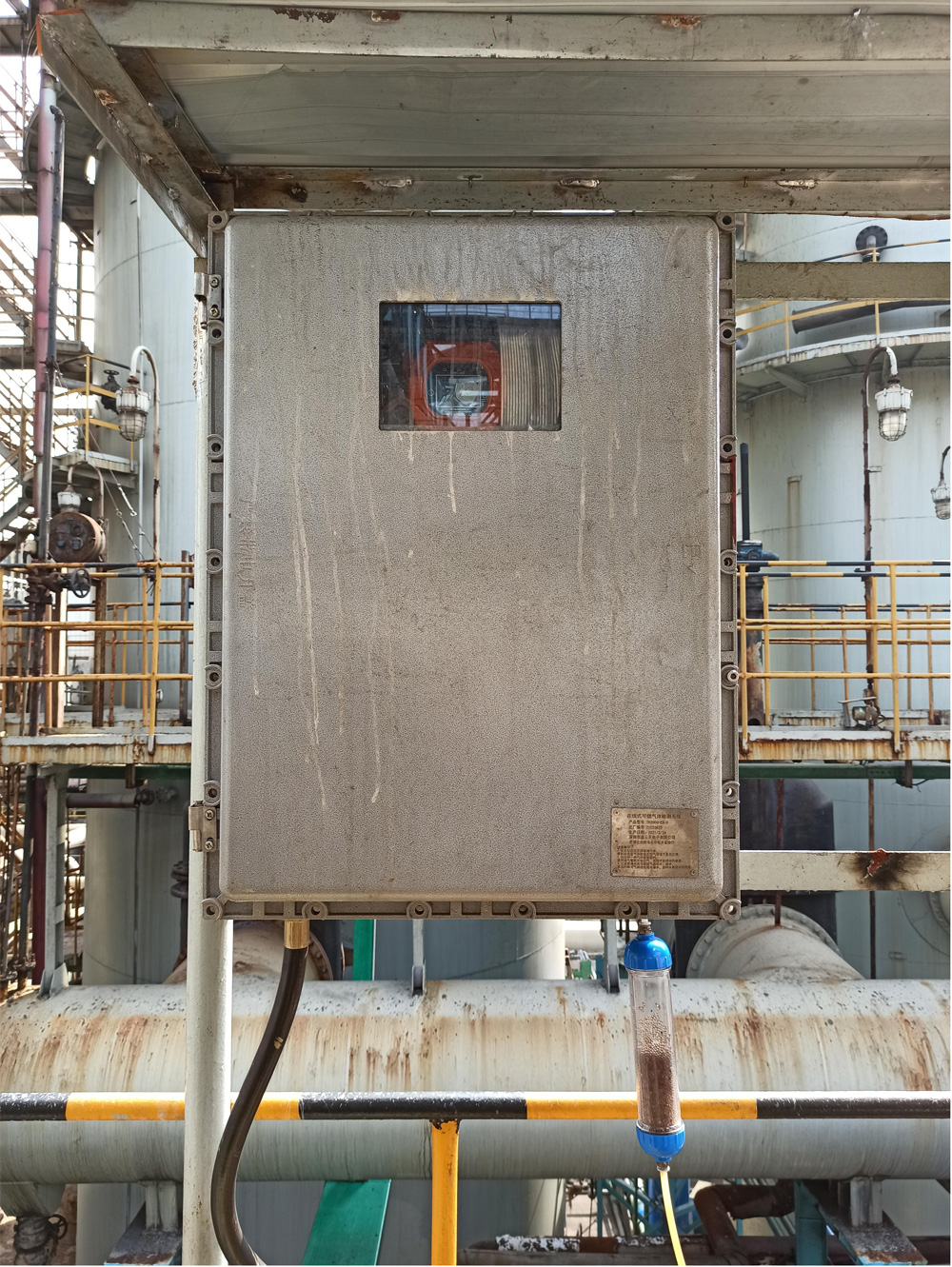 說明:由于現(xiàn)場排放尾氣溫度過高(100攝氏度以上),并且濕度太大,傳感器直接測量會影響使用壽命,并且客戶現(xiàn)場要求設(shè)備具有防爆;故加裝TH-2000-C-EX預(yù)處理系統(tǒng),內(nèi)置抽氣泵將尾氣抽取到監(jiān)測系統(tǒng)進行降溫,除濕等操作后輸送到MIC-600氣室進行有害因子檢測,并將檢測后的信號通過4-20mA信號傳輸?shù)絇LC進行集中監(jiān)控。